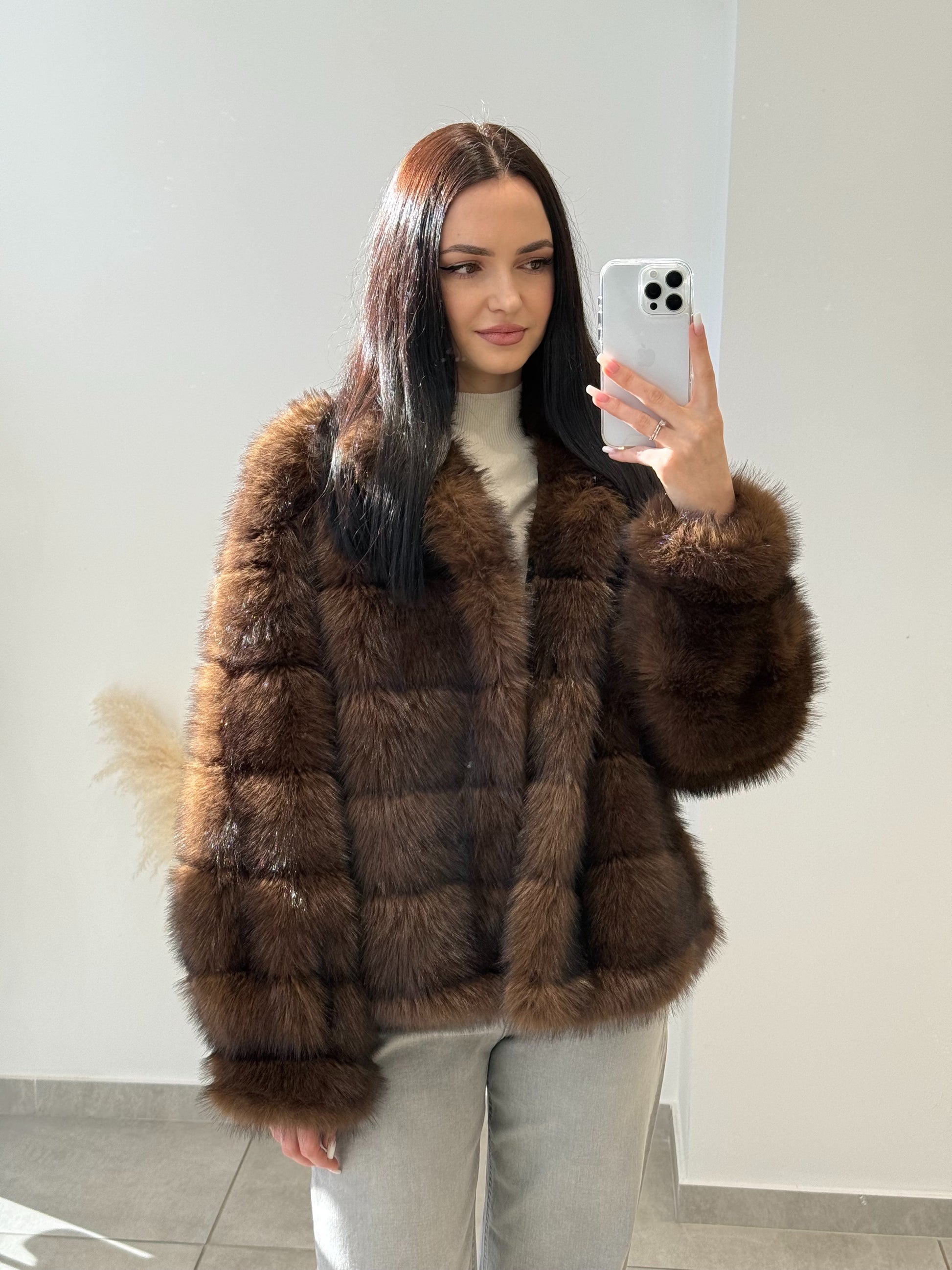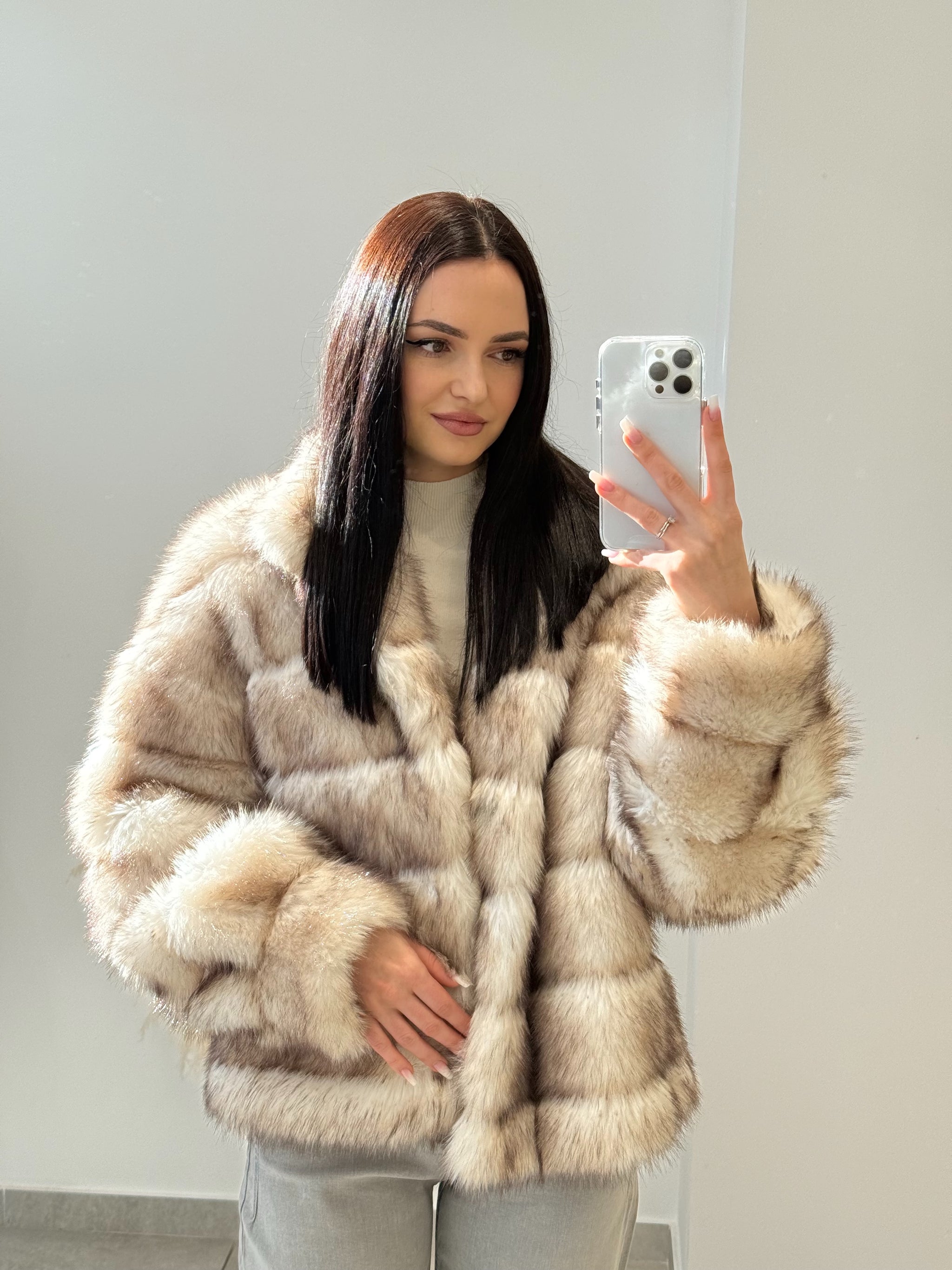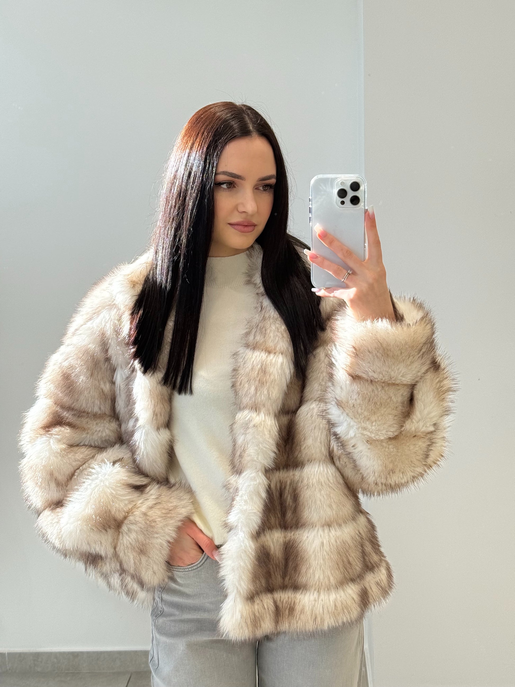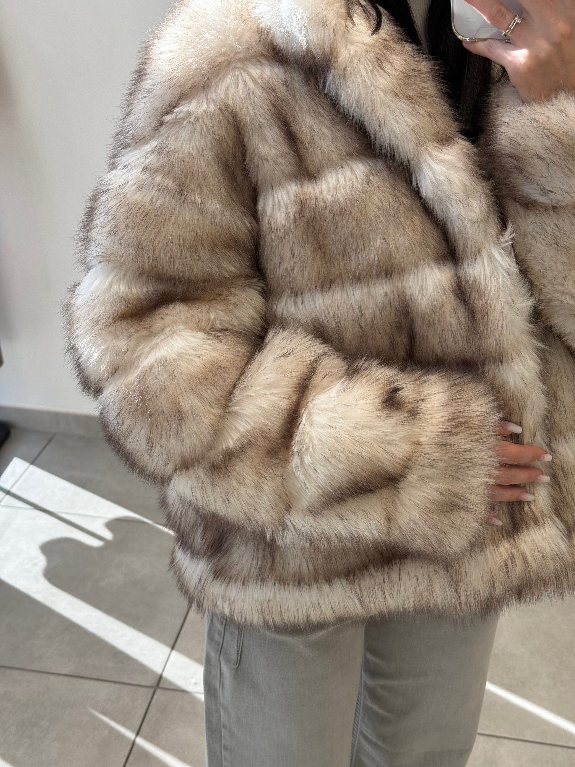 Blană ecologică cu textură moale și aspect pufos. Designul stratificat creează un efect vizual elegant și conferă un plus de căldură. O piesă ideală pentru sezonul rece, care îmbină perfect stilul cu funcționalitatea.