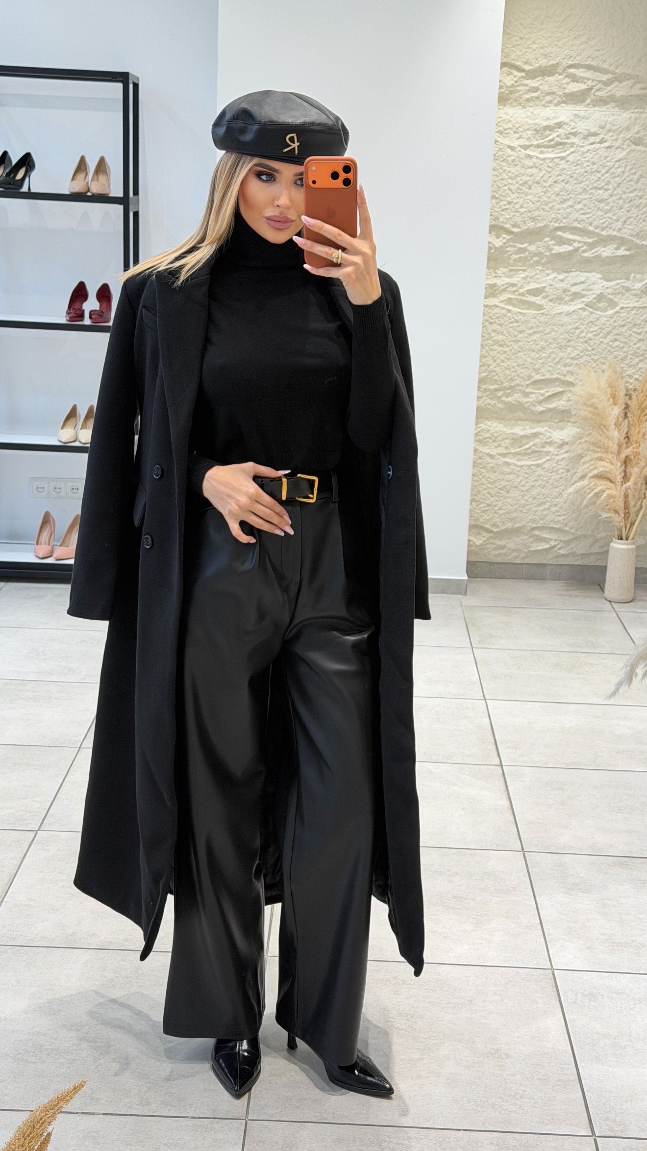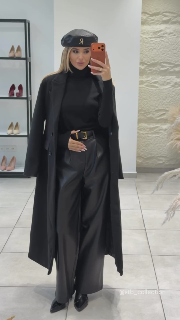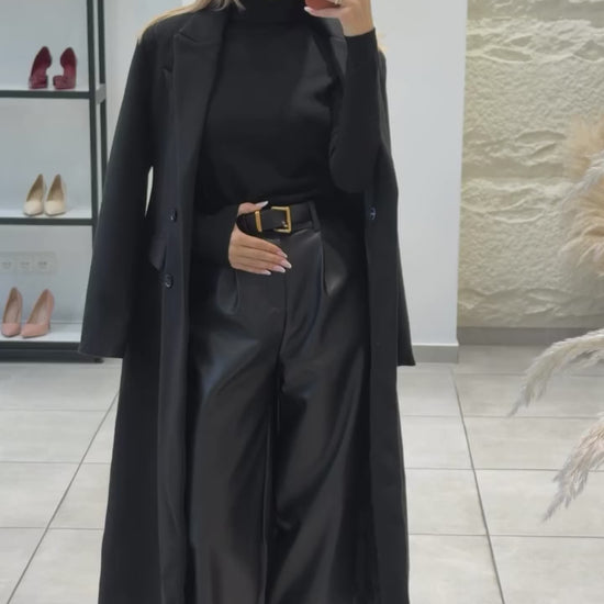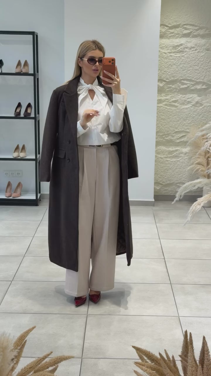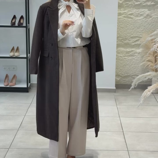 Palton lung elegant, cu talie accentuată și design minimalist.