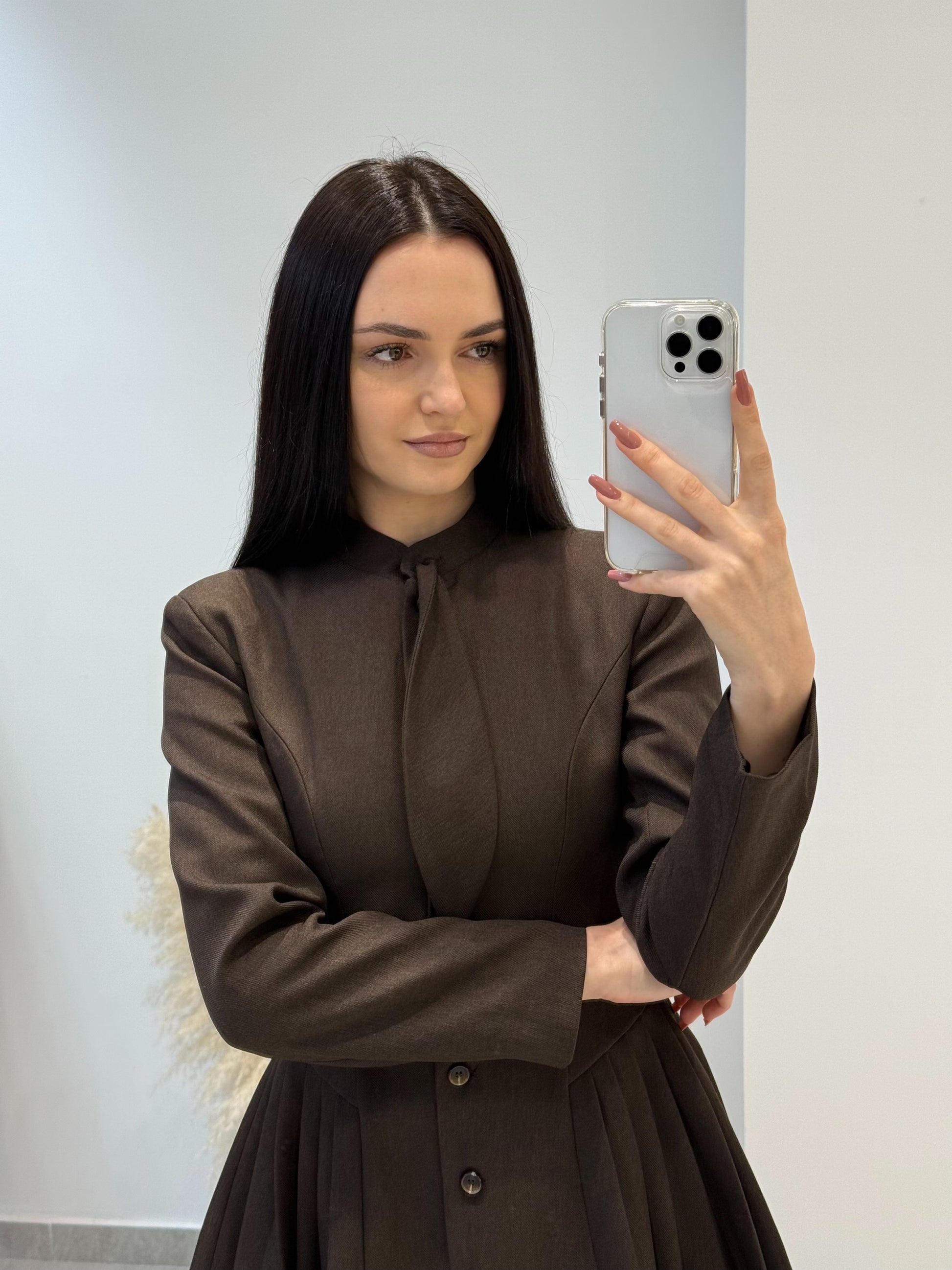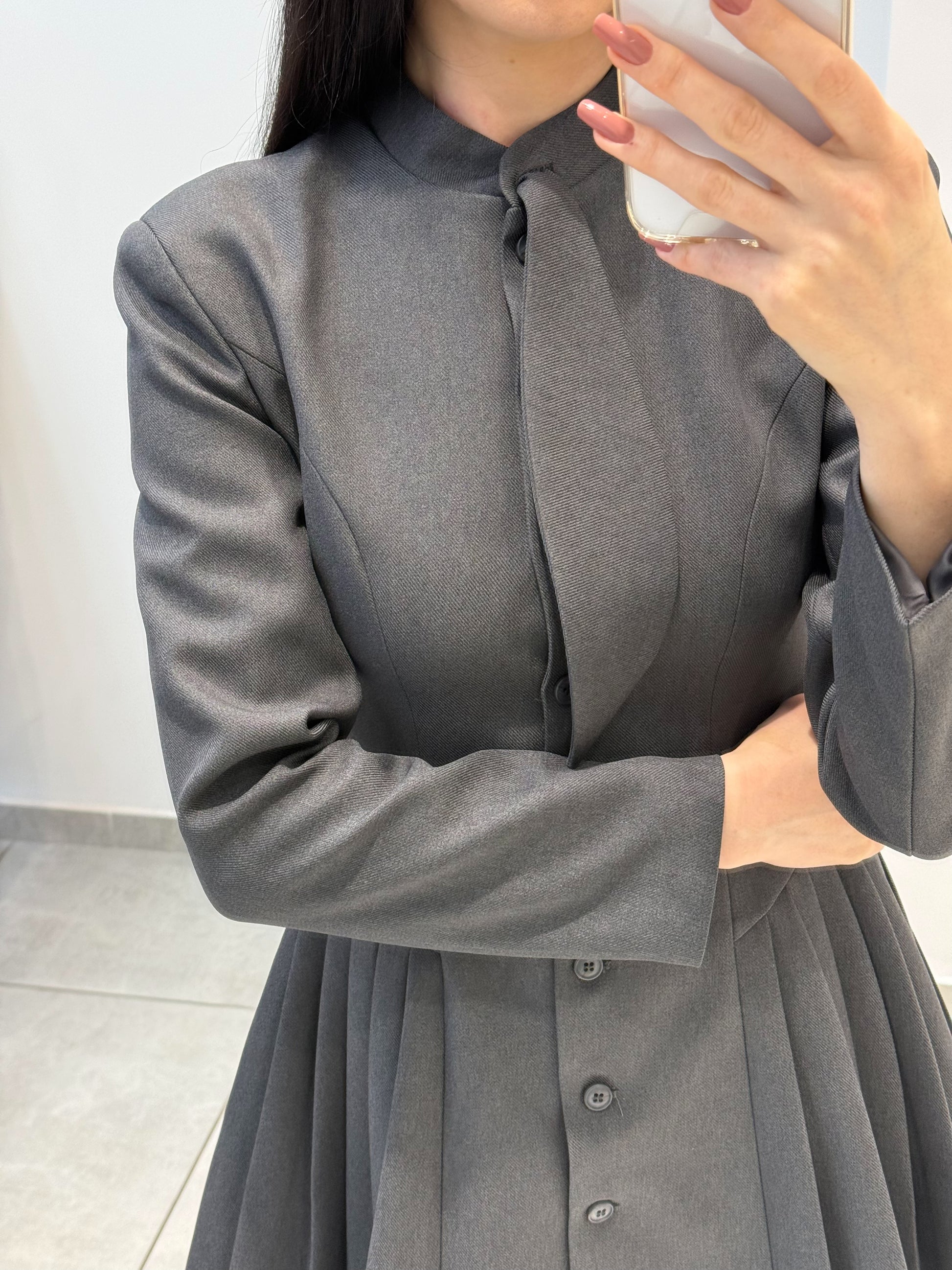 Rochie tip sacou cu fustă plisată. Modelul este evidențiat prin croi structurat în partea superioară, care conturează elegant talia, iar fusta plisată adaugă dinamism și rafinament siluetei.