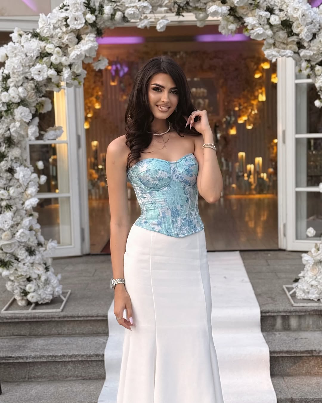 Corset fără bretele, cu structură evidențiată și imprimeu floral. Model ce evidențiază talia. O piesă elegantă, potrivită pentru ținute de ocazie sau evenimente speciale.