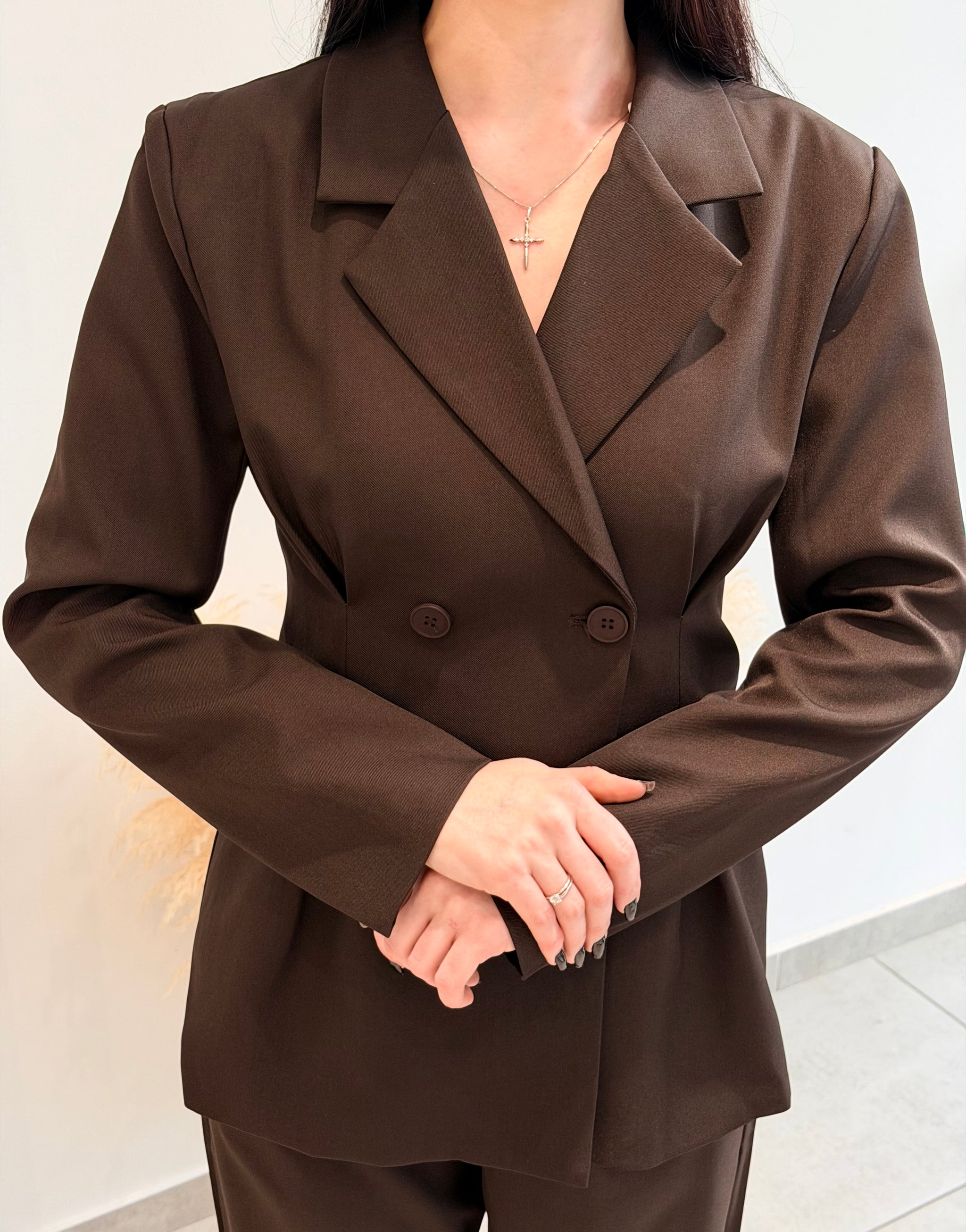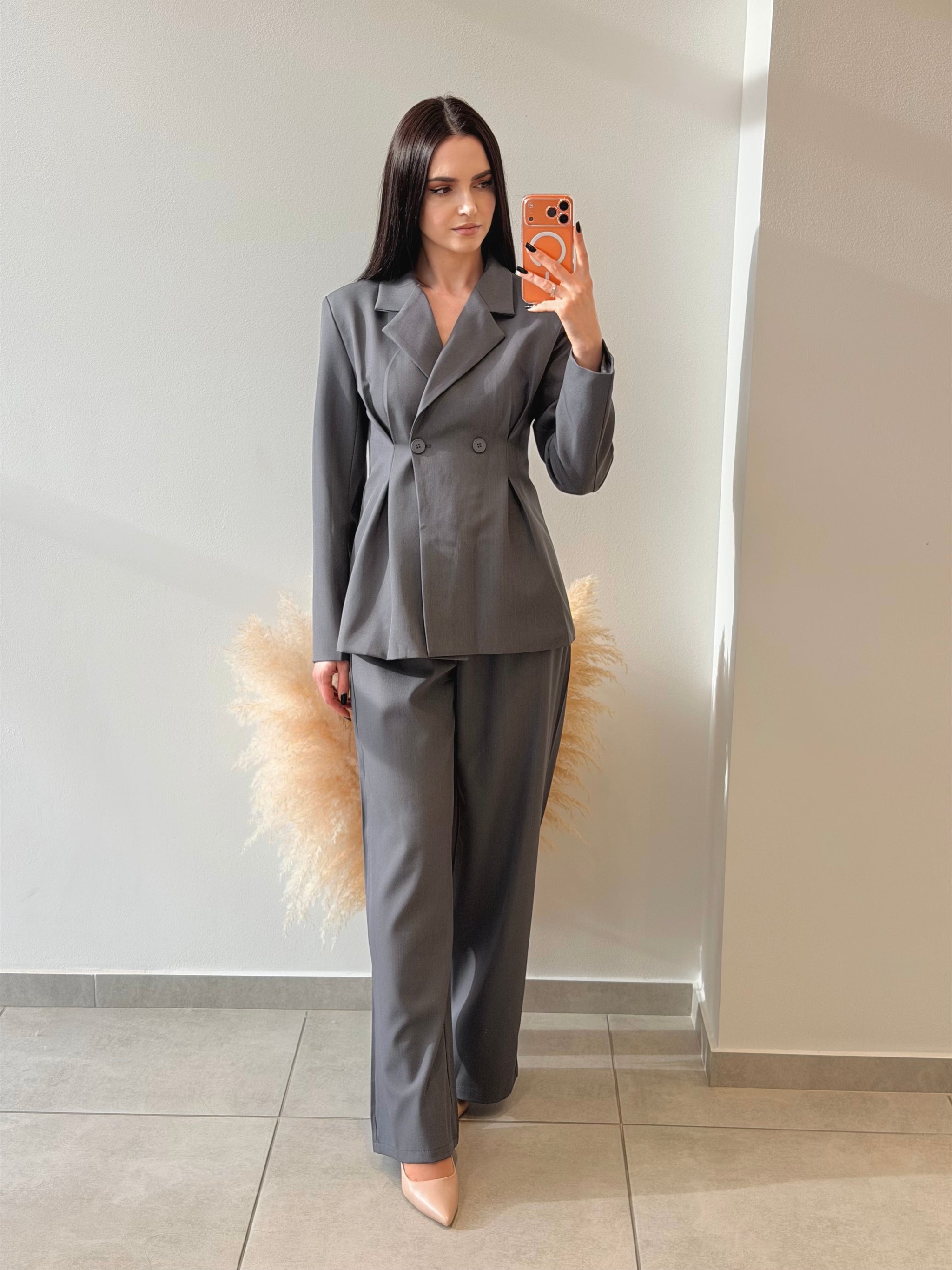 Costum cu sacou cambrat ce accentuează talia, prevăzut cu rever clasic și închidere dublă cu nasturi. Completat de pantaloni cu croială dreaptă, pentru un look elegant și bine definit.
