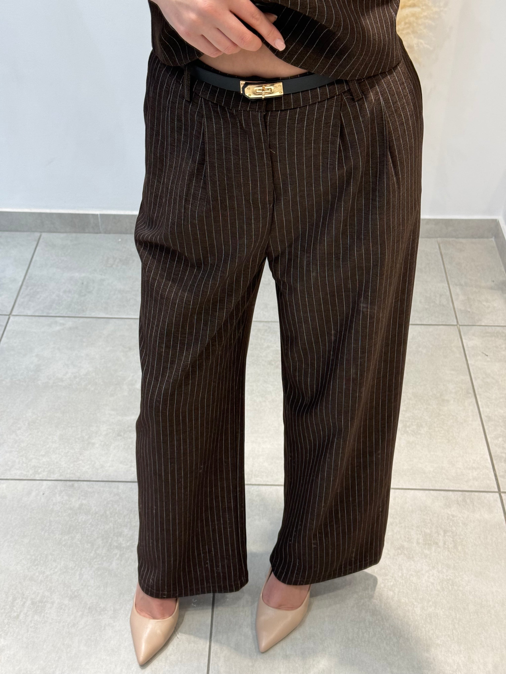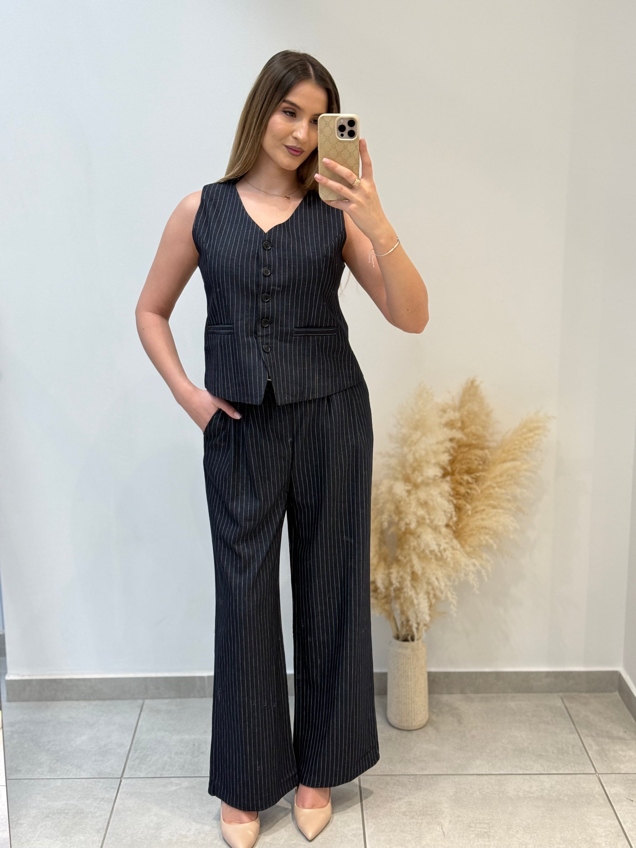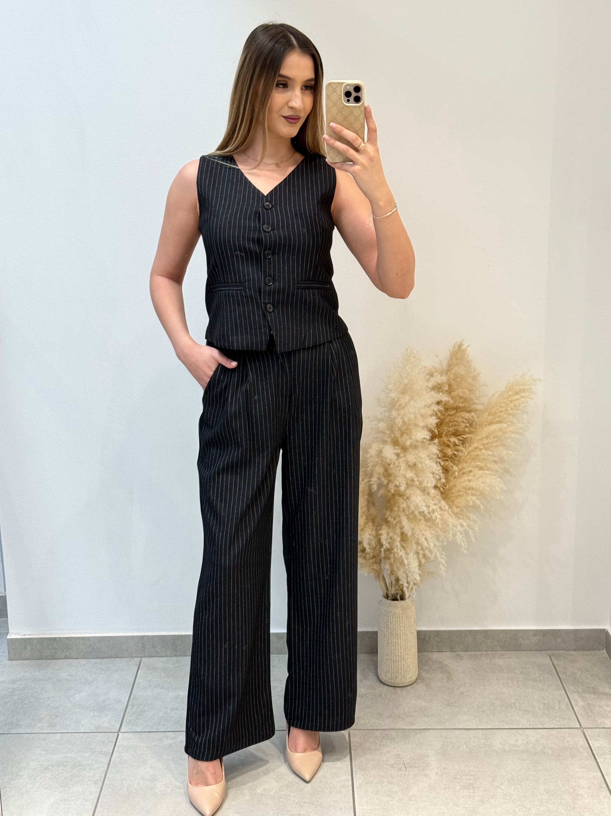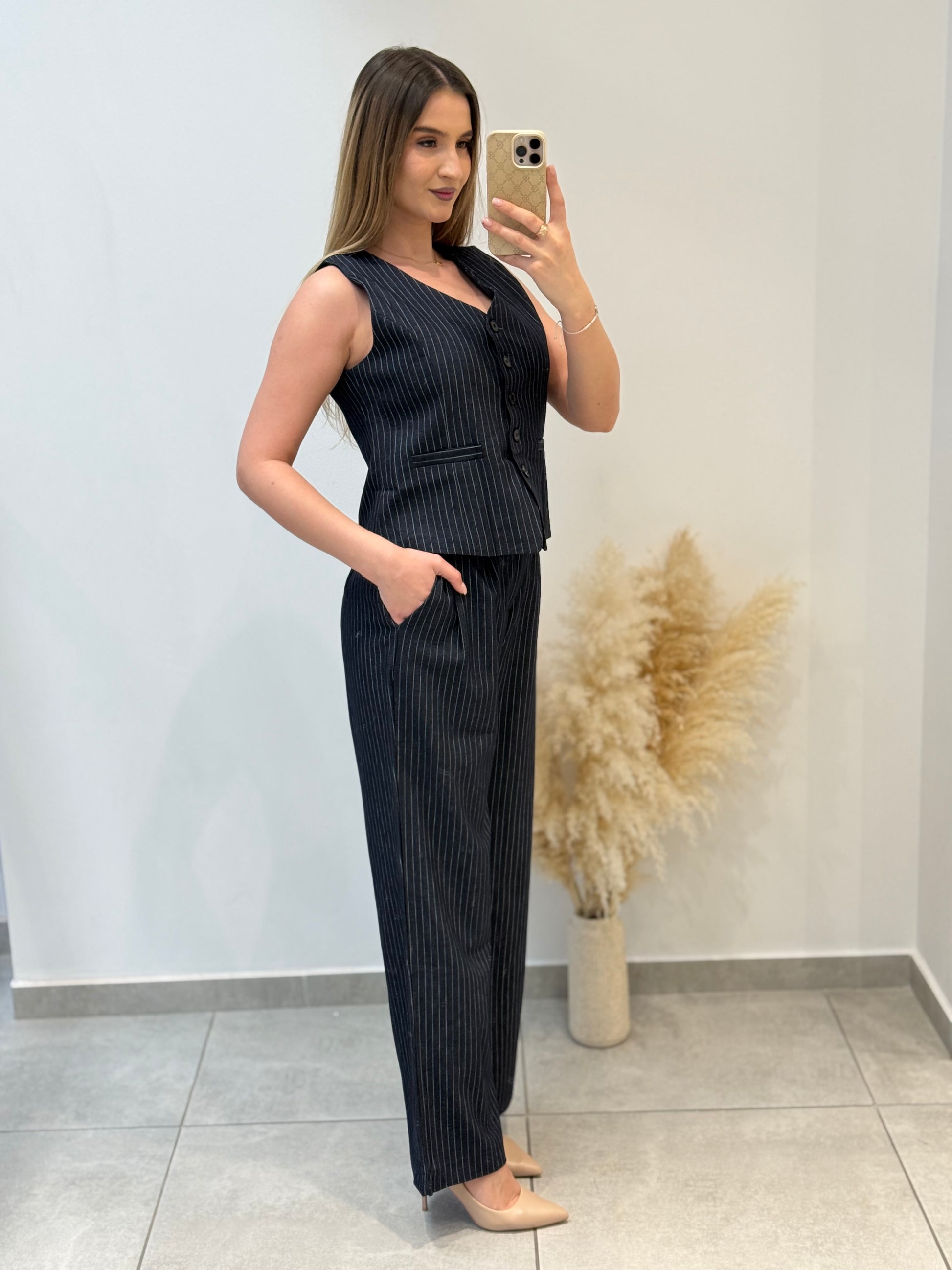 Costum în dungi fine, compus din sacou cu croială dreaptă, vestă cu nasturi și pantaloni evazați. Model potrivit pentru ținute office sau smart-casual.