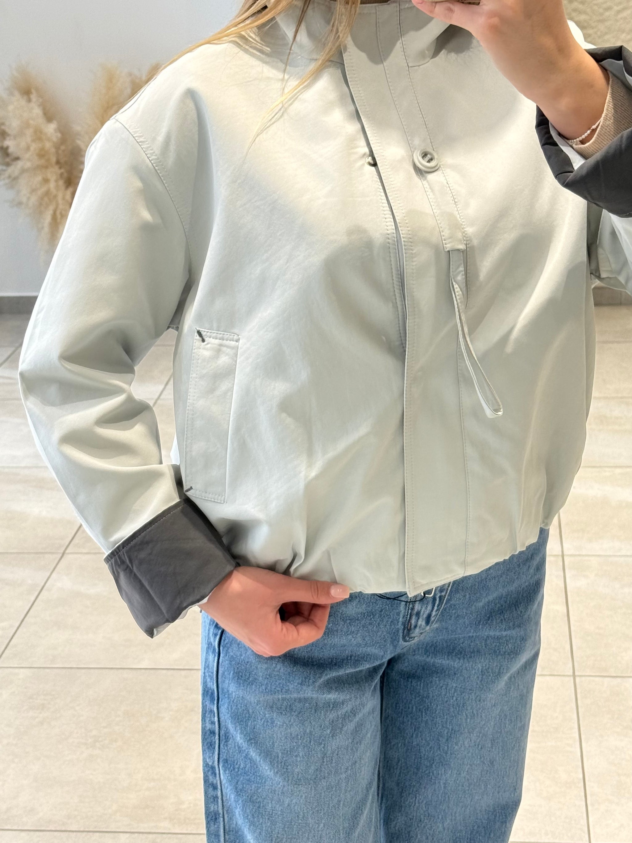 Jachetă cu guler înalt și închidere frontală ascunsă. Prevăzută cu șnur ajustabil și buzunare laterale discrete. Manșete contrastante și croială lejeră, cu linie modernă.