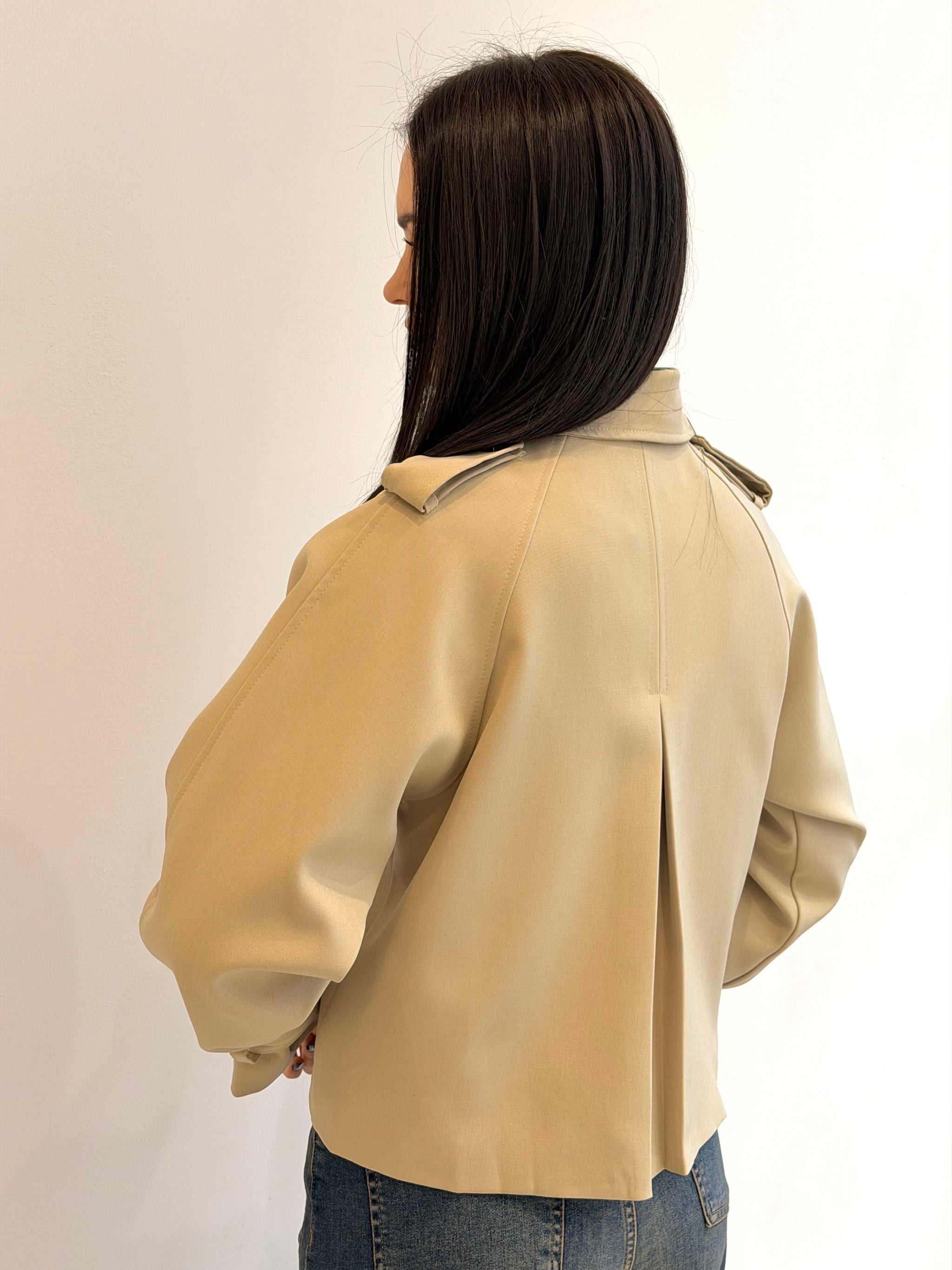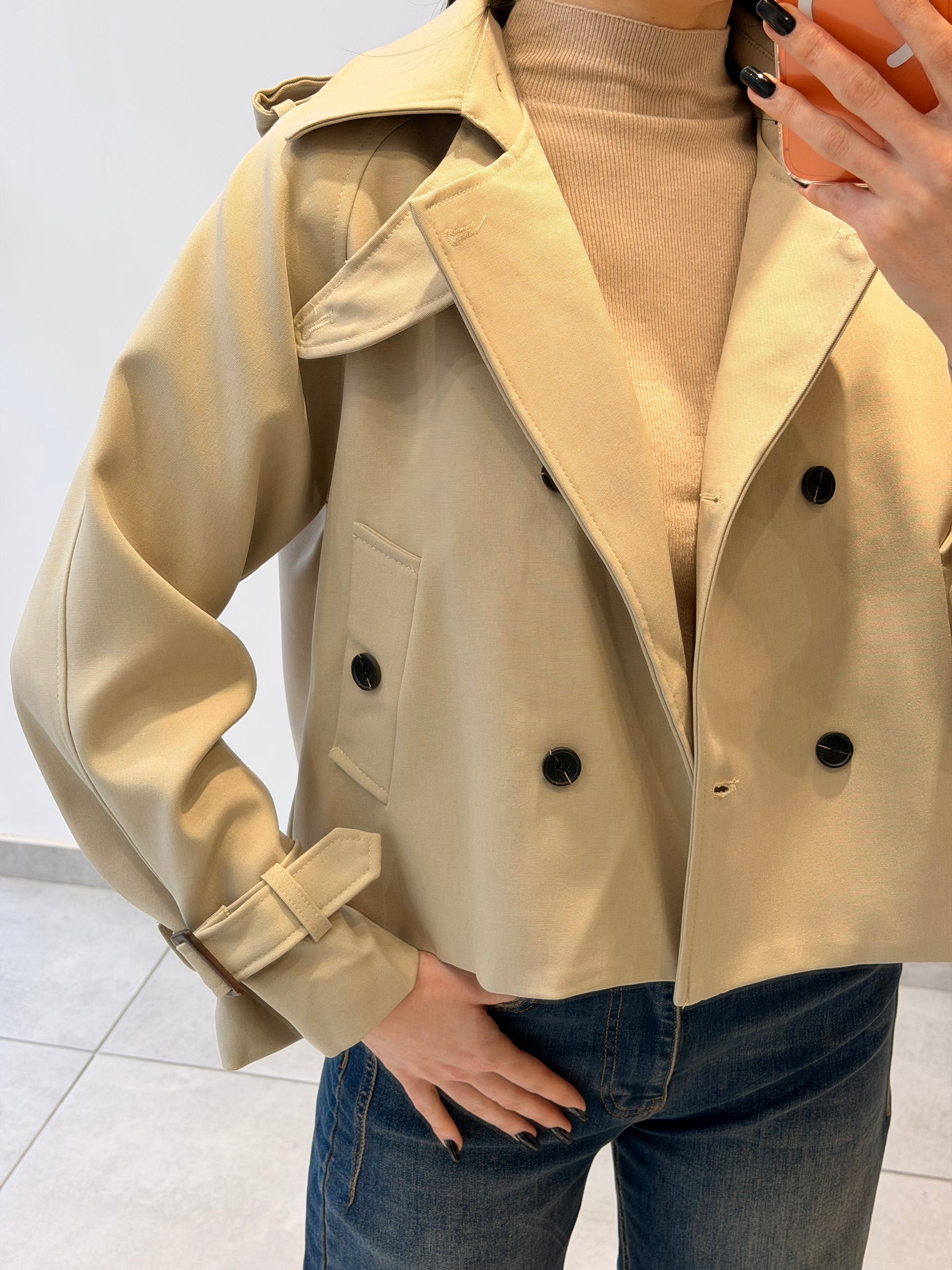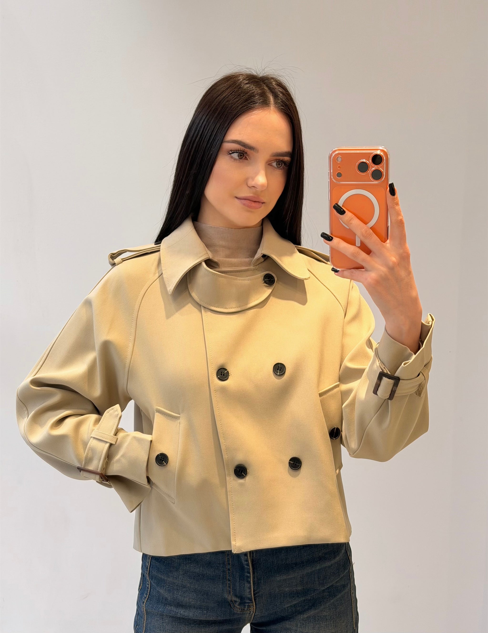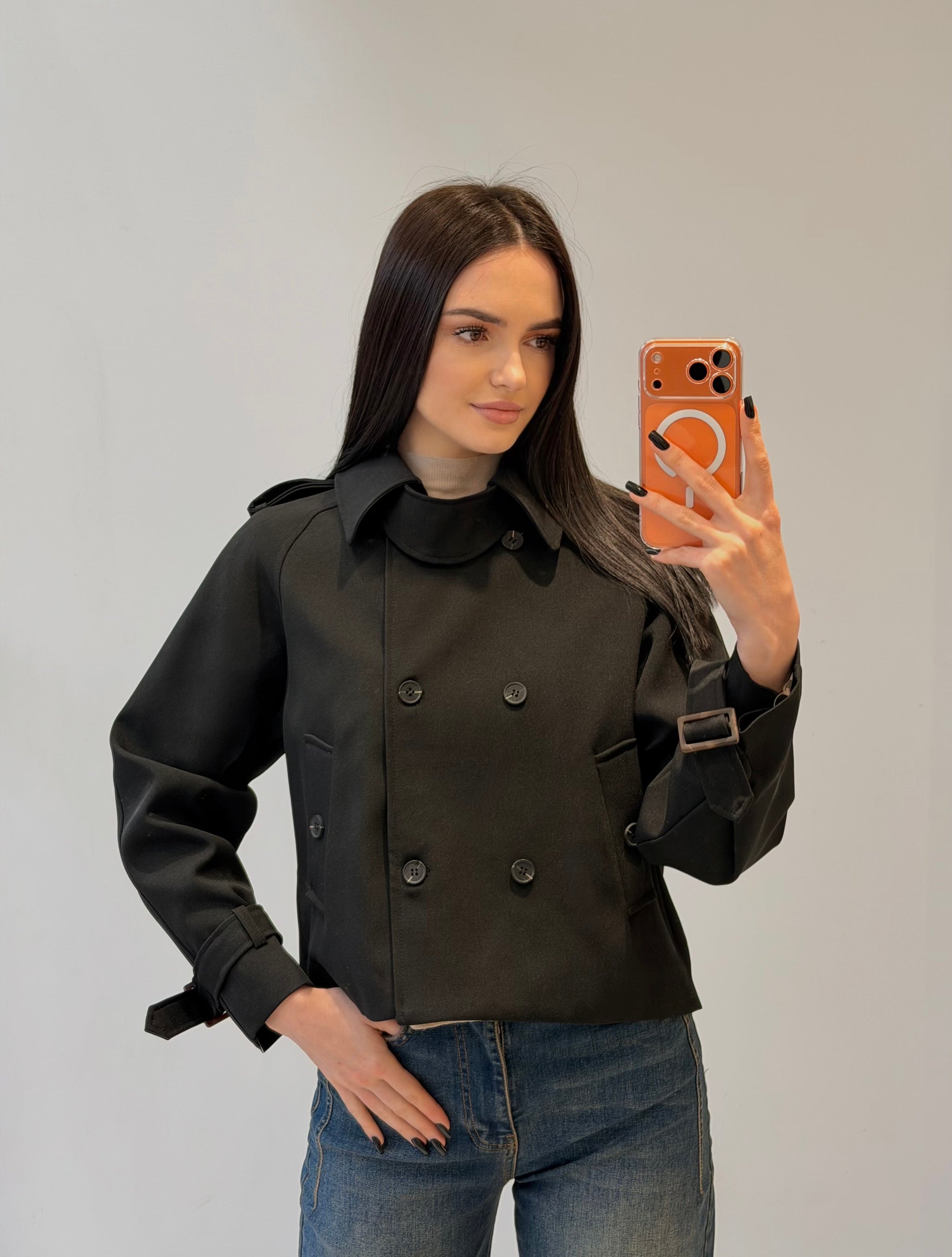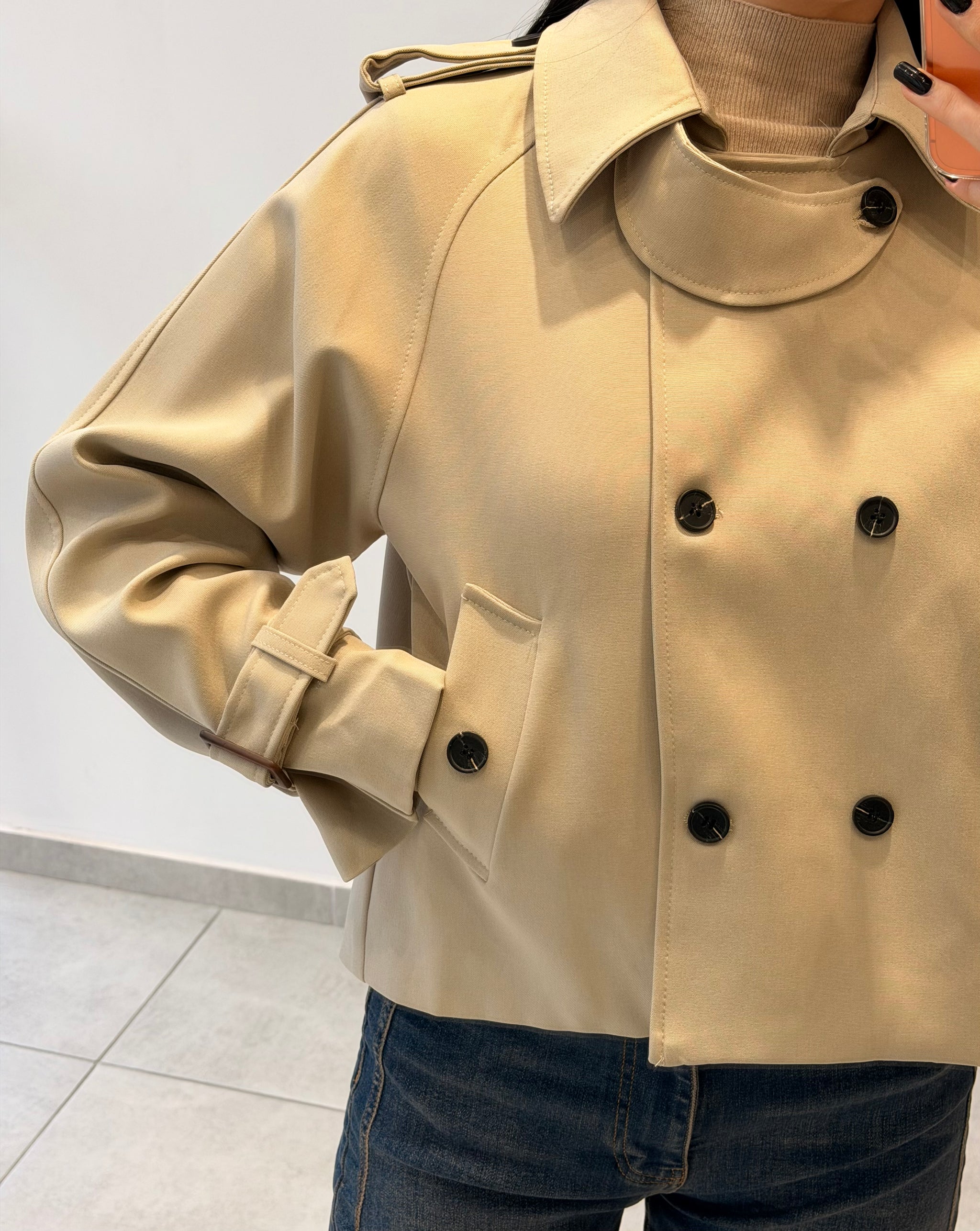 Trench scurt cu închidere dublă și guler clasic. Detalii cu curelușe ajustabile la mâneci și croială structurată. Un model elegant, potrivit pentru un look modern și rafinat.