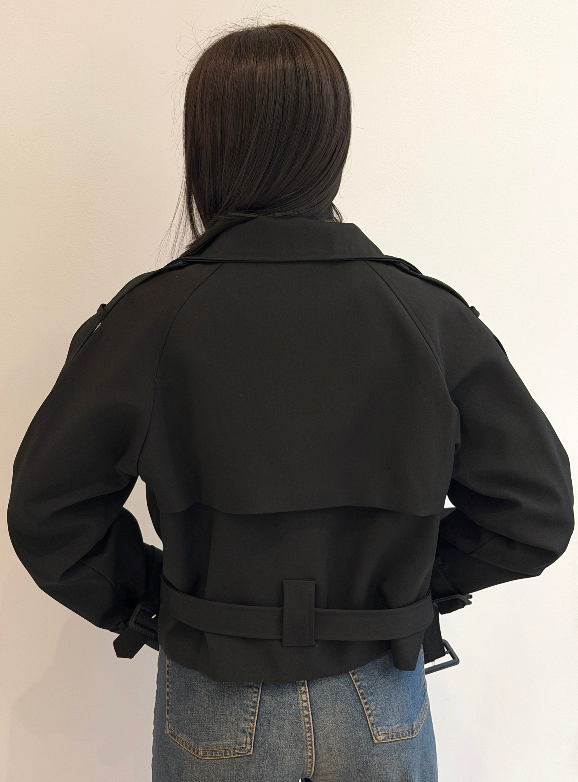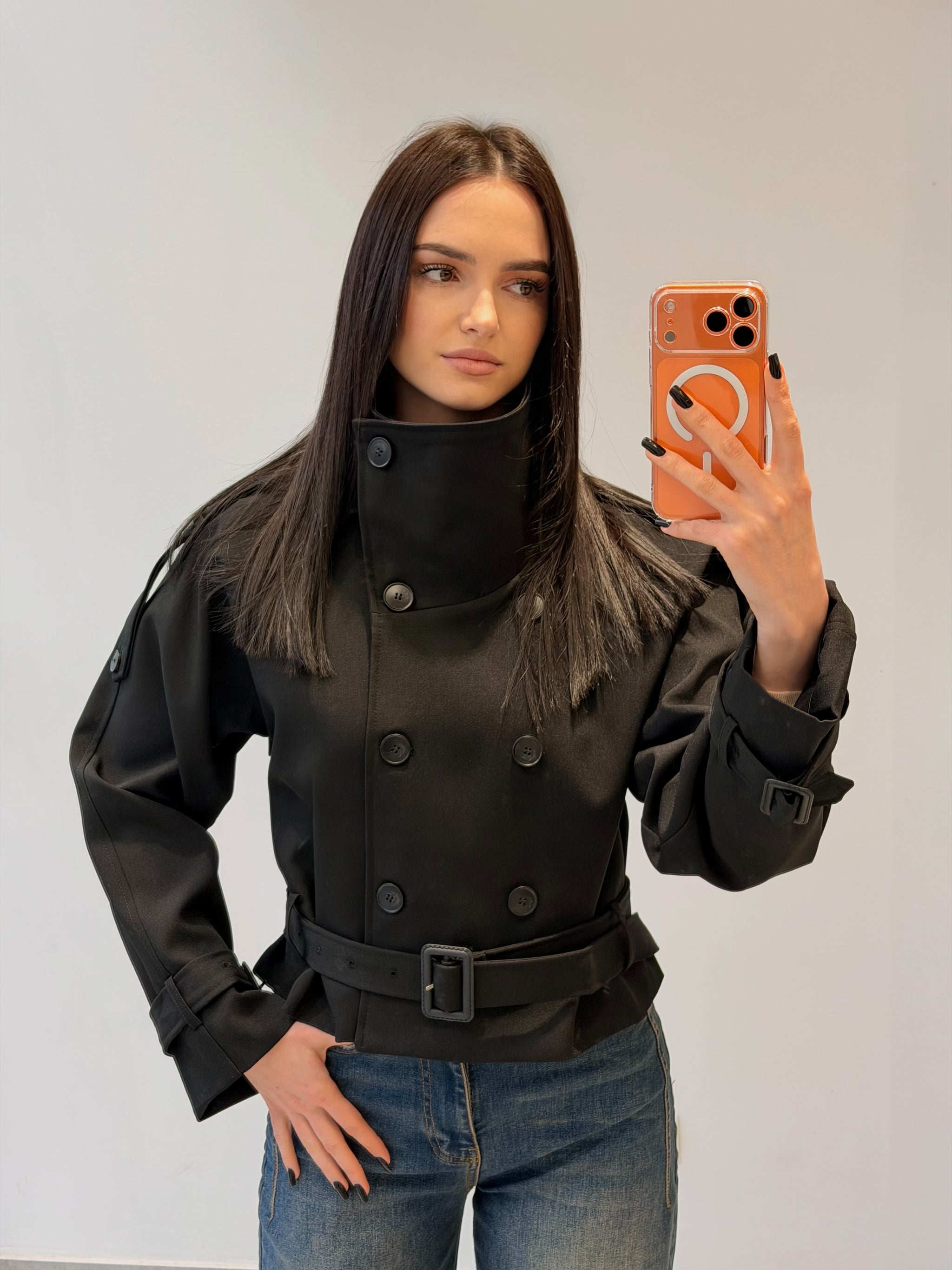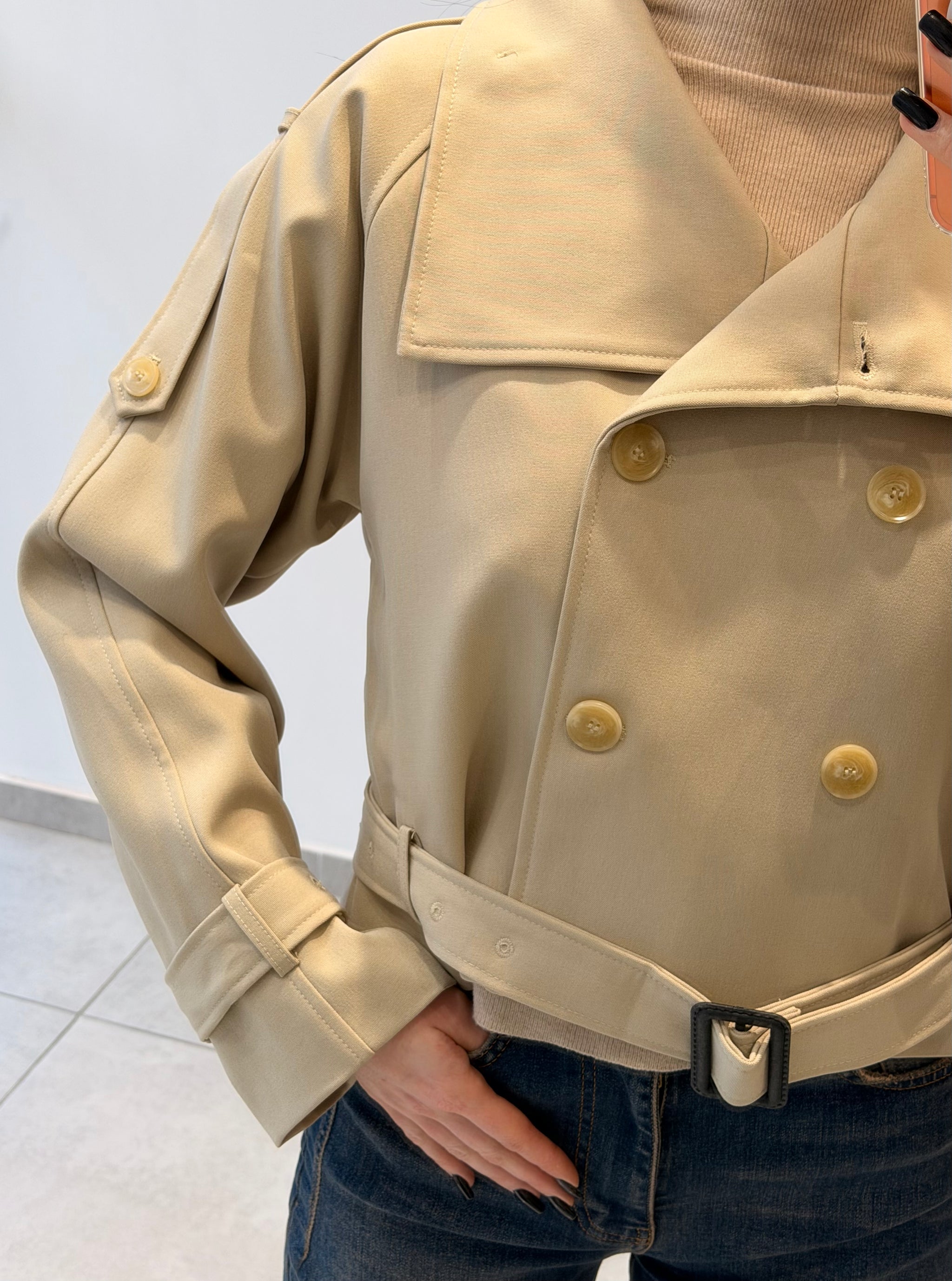 Trench scurt cu guler înalt și închidere dublă cu nasturi. Prevăzut cu cordon în talie și curelușe ajustabile la mâneci pentru un plus de structură. Croială modernă, ideală pentru un look sofisticat.